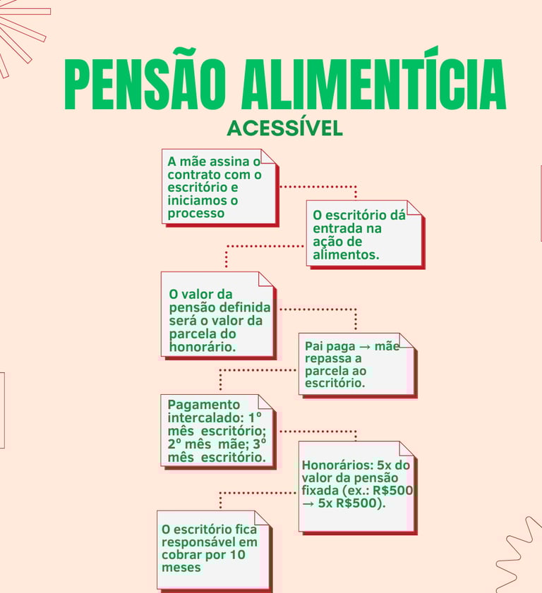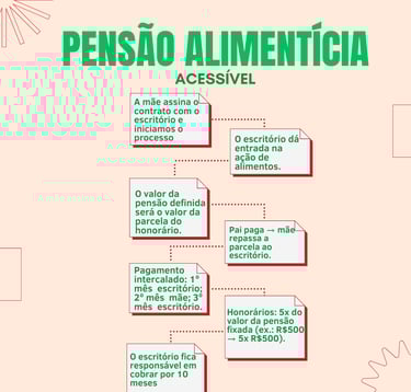 5) Só paga se receber: a mãe só repassa ao escritório quando obtiver o pagamento; se houver atraso, o escritório atua para cobrar os valores devidos durante o período contratual.